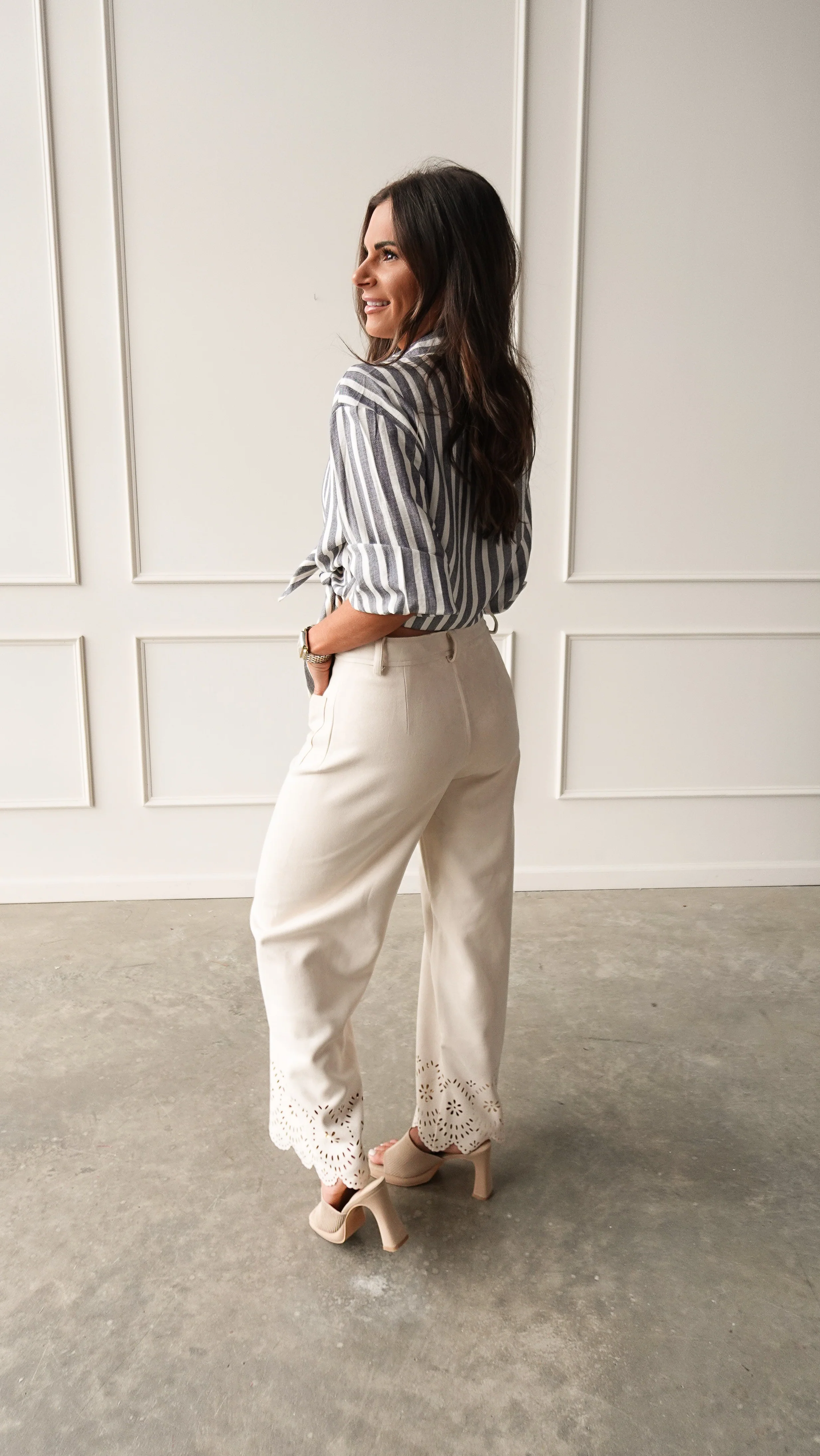 The Bone Suede Pant with Eyelet Detail has a clean, structured look with the prettiest scalloped cutwork hem—simple at first glance, but full of subtle detail.