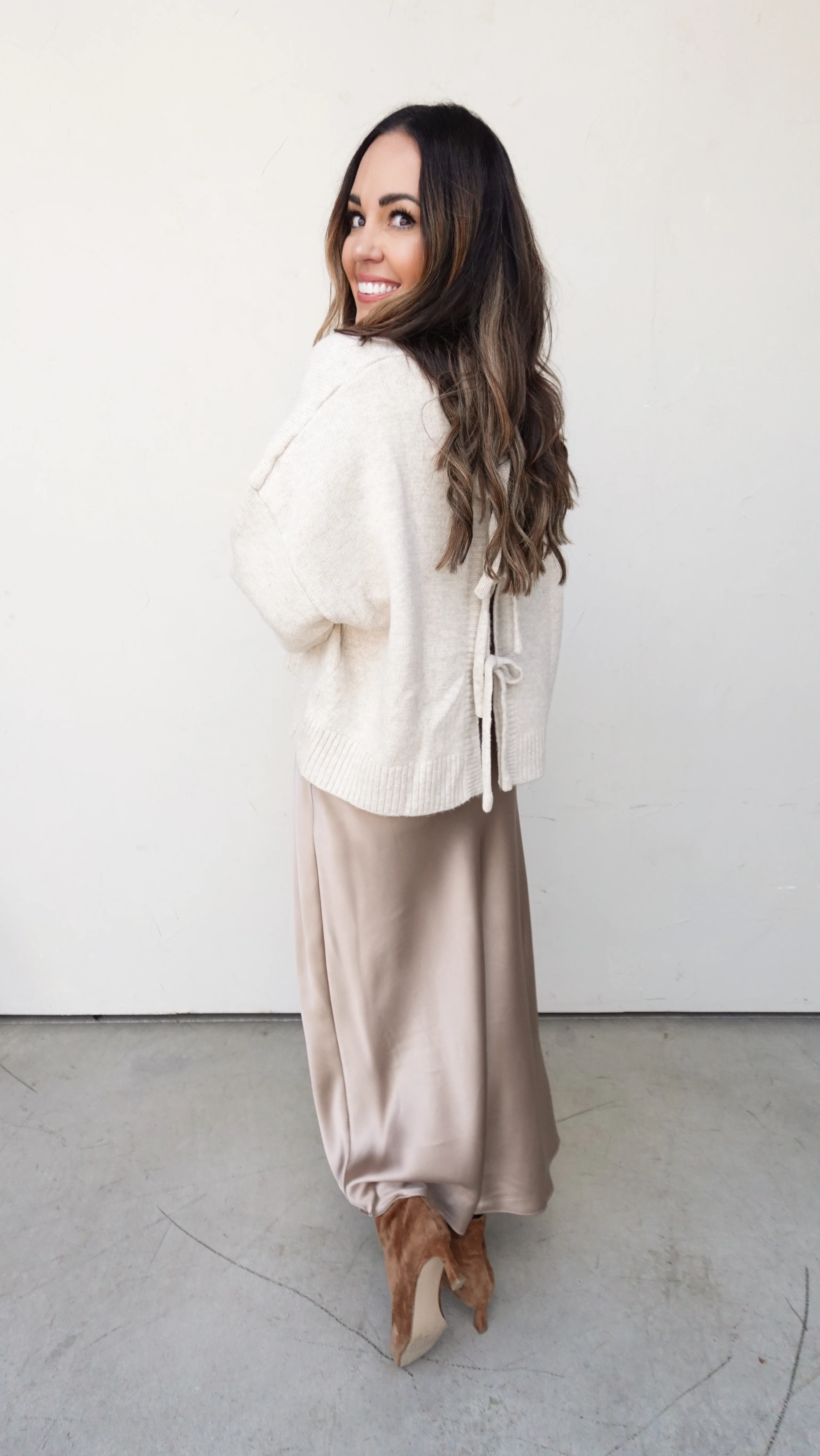 Champagne midi skirt with a satin finish that drapes beautifully with movement