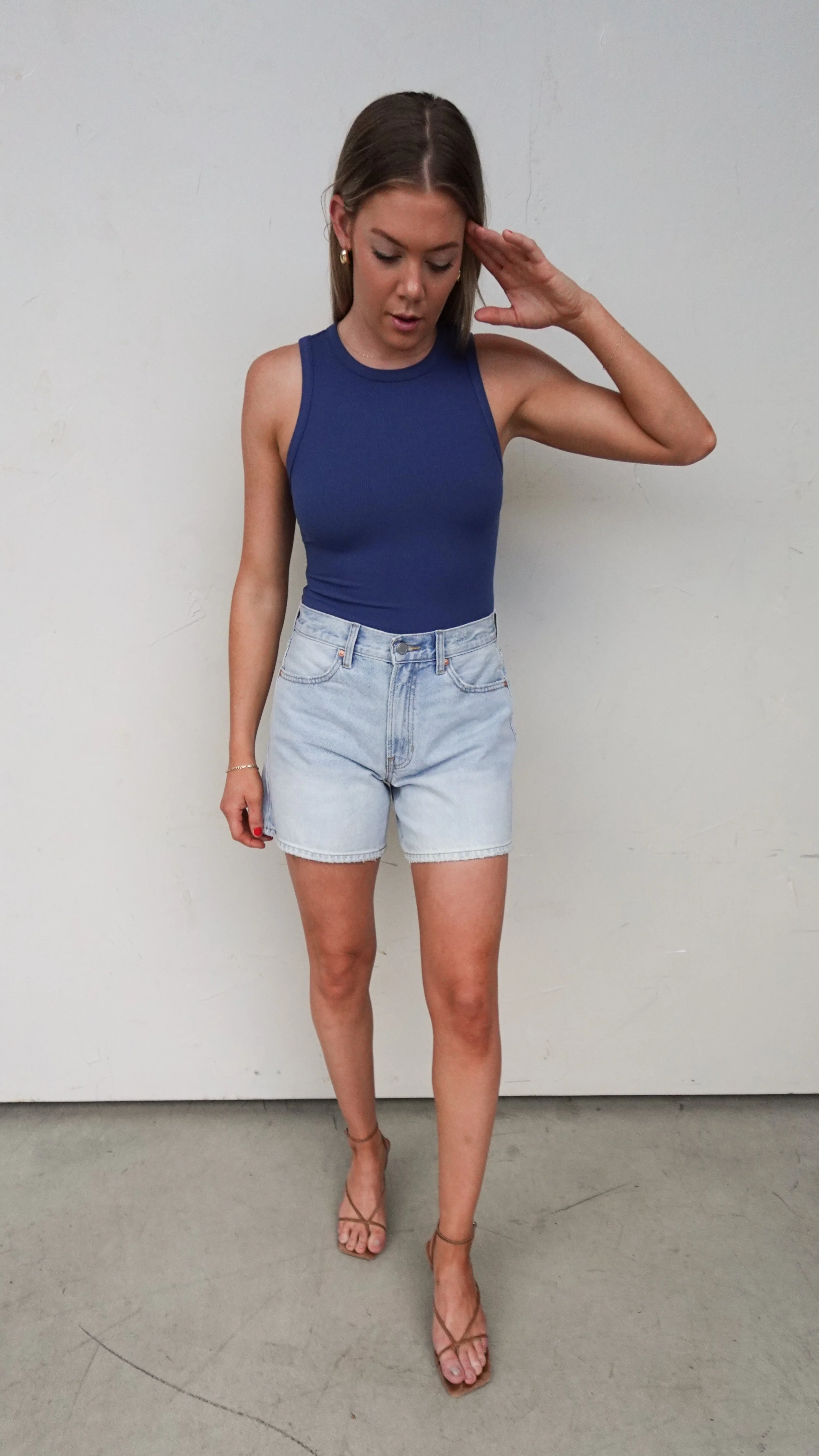 - Light wash high-waisted denim shorts