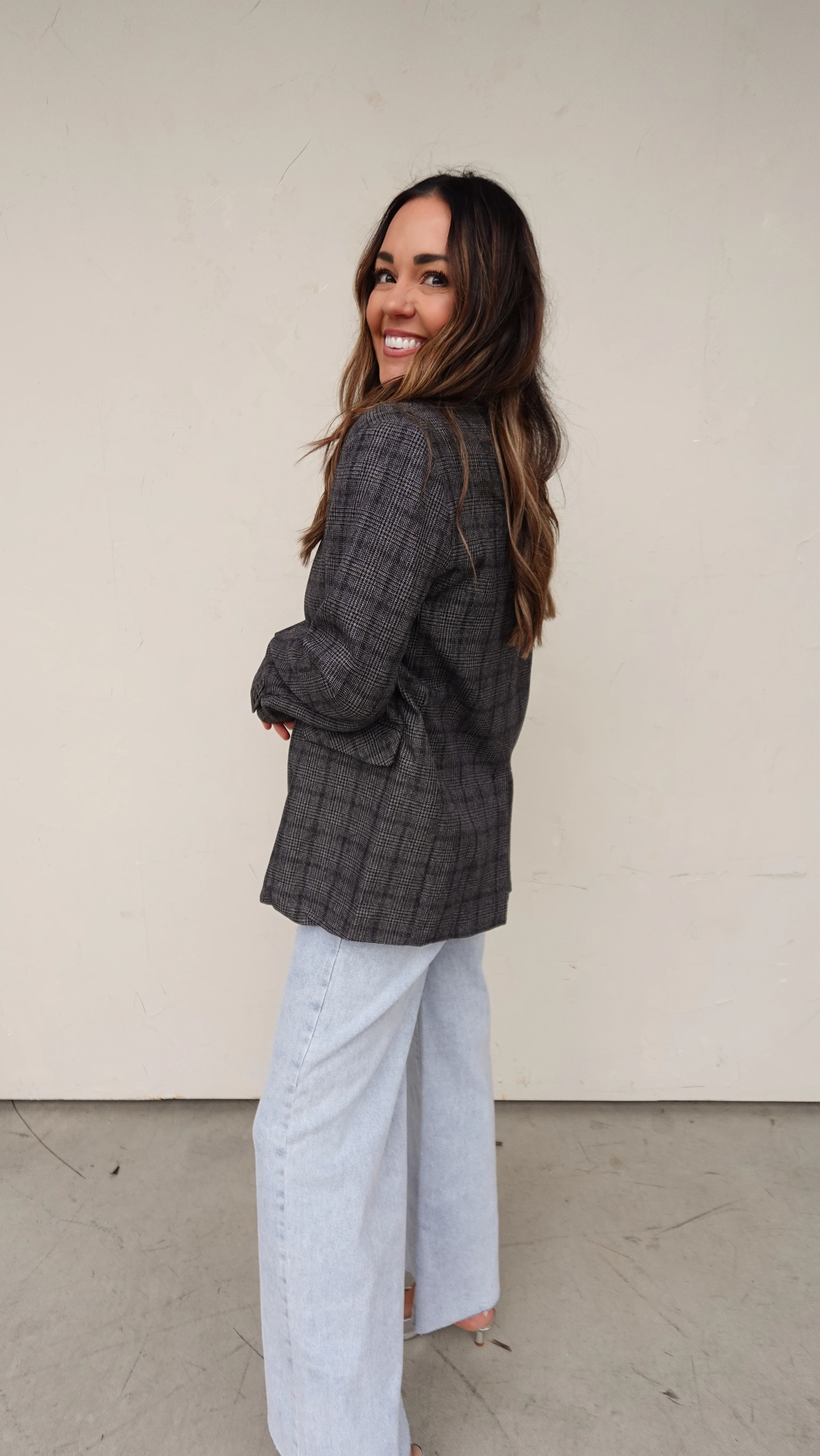 A timeless grey plaid blazer with that perfectly borrowed-from-the-boys feel—structured, cool, and endlessly wearable.